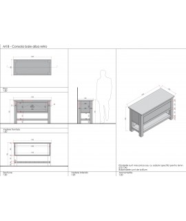 Aceasta consola pentru lavoar baie este realizata din lemn masiv de rasinoase cu grosimea de 2,7cm. Produsul include o rama perimetrala in zona din fata menita sa ofere un aspect placut, dar si rol structural. Consola este prevazuta cu o usa batanta (deschidere in jos) in partea superioara (rol functional si de ascundere a sifonului) si o polita tip riflaj in zona inferioara. Dimensiunile produsului de prezentare sunt 110cm (L) | 75cm (h) | 50cm (a).