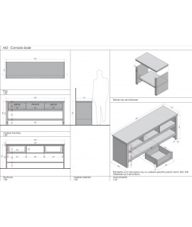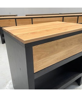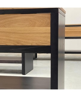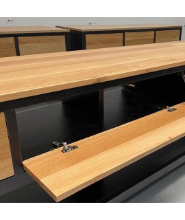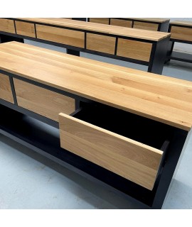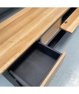 Realizata din lemn masiv de stejar (in ceea ce priveste blaturile si fetele de sertare) si lemn masiv de rasinoase (in ceea ce priveste corpurile baituite in culoarea negru), aceasta consola pentru lavoar (baie) combina avantajele ambelor materiale: rezistenta lemnului masiv de stejar pentru zone de trafic intens si respectiv greutatea reduse, predispozitia la baituire si rezistenta la umiditate a lemnului de rasinoase. Feroneria utilizata este Blum.