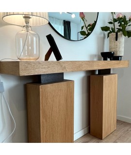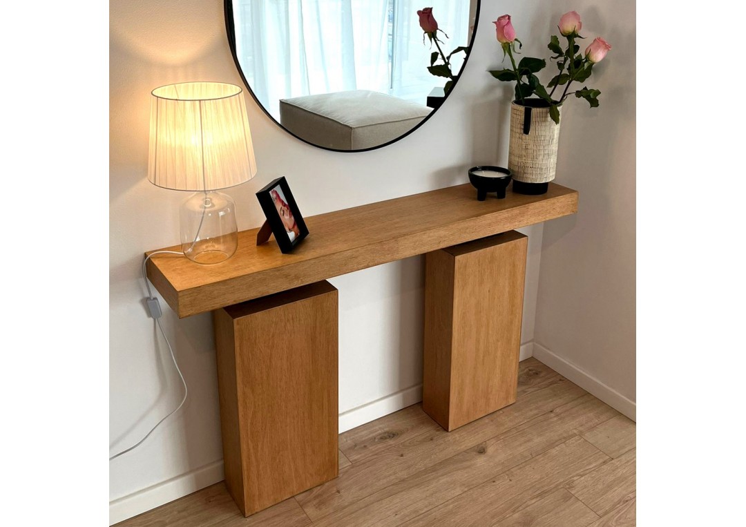 Consola pentru living sau hol cu 2 picioare groase este realizata din lemn masiv de stejar sau plywood mesteacan avand o grosime de 2cm. Imbinarile la 45 de grade creaza produse / carcase fara muchii / canturi vizibile. Dimensiuni produs prezentare: 110cm (L) / 75cm (h) / 25cm (a). Un obiect de design potrivit casei dvs. Produsul se livreaza asamblat.