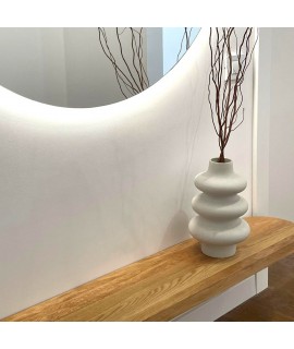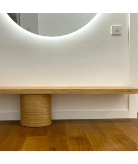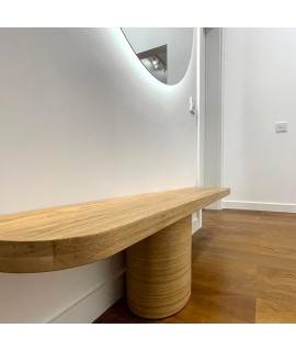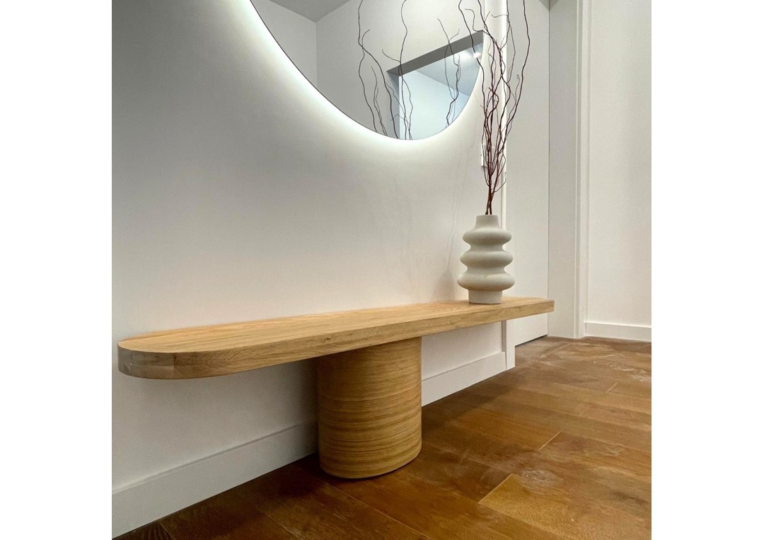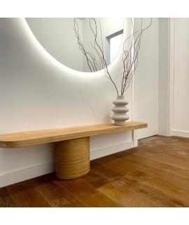 O consola pentru hol cu aer japandi asteapta sa-si gaseasca locul in casa dvs. Realizata din lemn masiv de stejar cu grosimea de 4cm, consola este alcatuita dintr-un raft cu dimensiunile 150cm(L)x25cm (l) rotunjit la capete si un picior sub forma unei elipse cilindrica (realizata din lemn masiv de rasinoase furniruit cu stejar natural) cu dimensiunea 30cmx20cmx25cm(h). Pentru stabilitate si sustinere se folosesc prinderi ascunse pe perete (ce patrund in miezul raftului) si sprijin pe picior. Produsul se livreaza asamblat si are o greutate ridicata. Coletul contine prinderile ascunse. Montajul produsului la locatie nu este inclus. Produsul nu poate fi utilizat cu destinatia de bancheta.