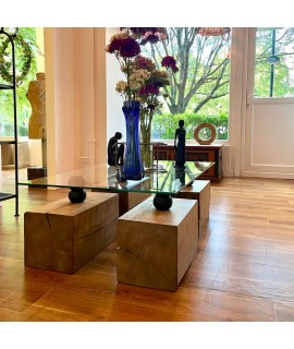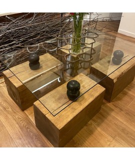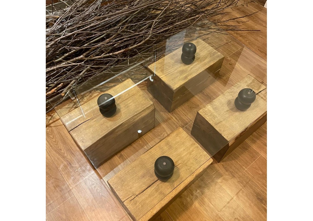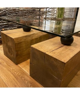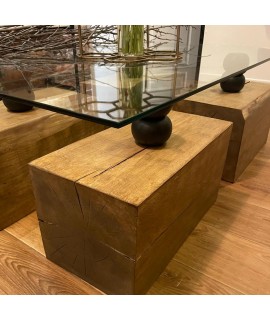 Masuta cafea lemn masiv (butuci), blat de sticla (110 x 70cm)